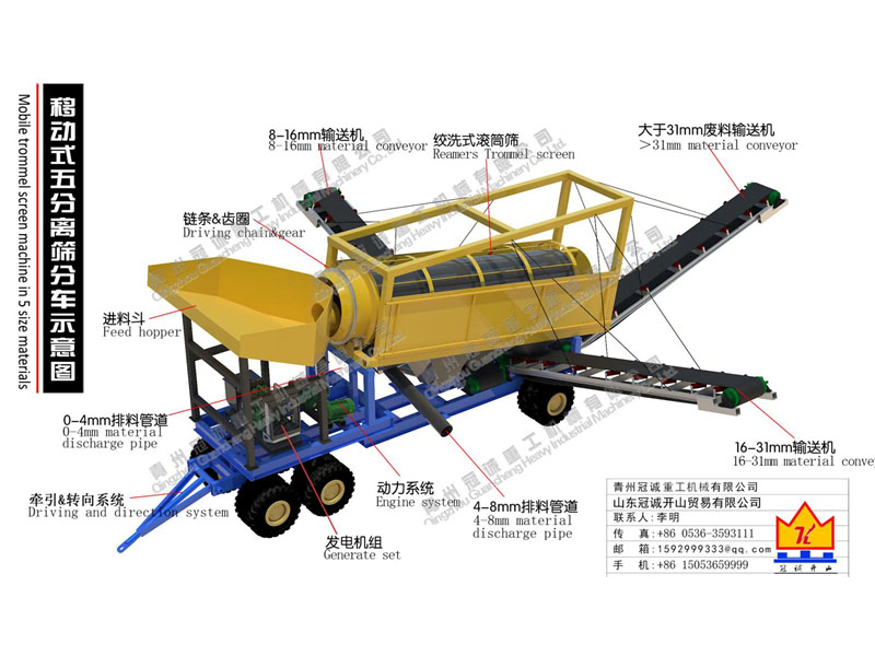 洗石機中篩分很重要,山東洗石設備廠家為您推薦一款移動式洗石篩分車,本設備設計結構合理緊湊,發電機組集成在底盤上,附帶牽引&轉向系統,可以使用牽引車輛輕松移動至工作場地;其中篩分系統使用了新型核心技術的絞洗式滾筒篩