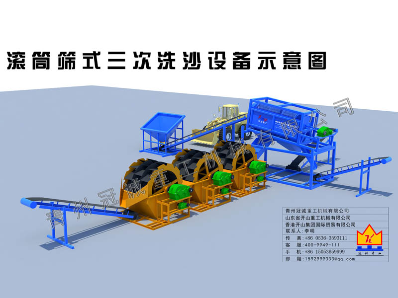 原料通過裝載機或者挖掘機,把物料送入料斗,通過振動給料機把物料勻速的送到上料輸送機,輸送機把物料送入滾筒篩,滾筒篩采用中央供水系統,通過滾筒篩高壓水把污泥,細沙,中沙,分解分離,細沙進入三臺輪式洗砂機進行脫泥【含泥量低于千分之五,達到混凝土攪拌站和高架橋用沙標準】脫水之后把干凈的沙送入成品料細沙輸送機輸送到指定位置,中沙進入中沙成品輸送機,把中沙送到指定位置,廢料通過廢料輸送機,把廢料送到廢料區,【注明:滾筒篩的篩分規格可以通過更換篩片的規格隨時可以調節更換范圍3mm--2cm】