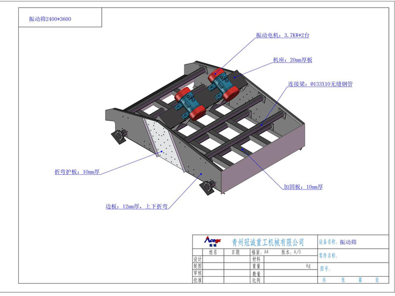 規(guī)格:2400*3600mm 振動(dòng)電機(jī):3.7KW*2臺(tái) 邊板厚度:12mm 料斗:板厚5mm |